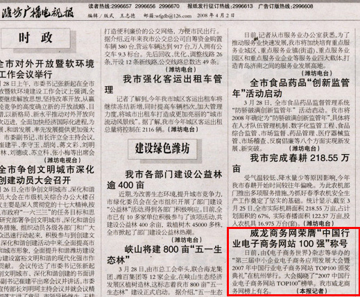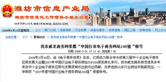 威龍商務網(wǎng)上榜“2007中國行業(yè)電子商務網(wǎng)站100強”